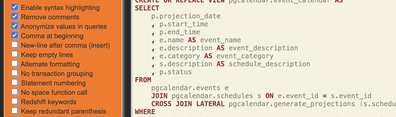 pgFormatter 5.7: A Tool to Format SQL Code — You can test it out online, or you can grab the source from GitHub (it’s written in Perl) and run it for yourself. What’s new in v5.7. Gilles Darold |