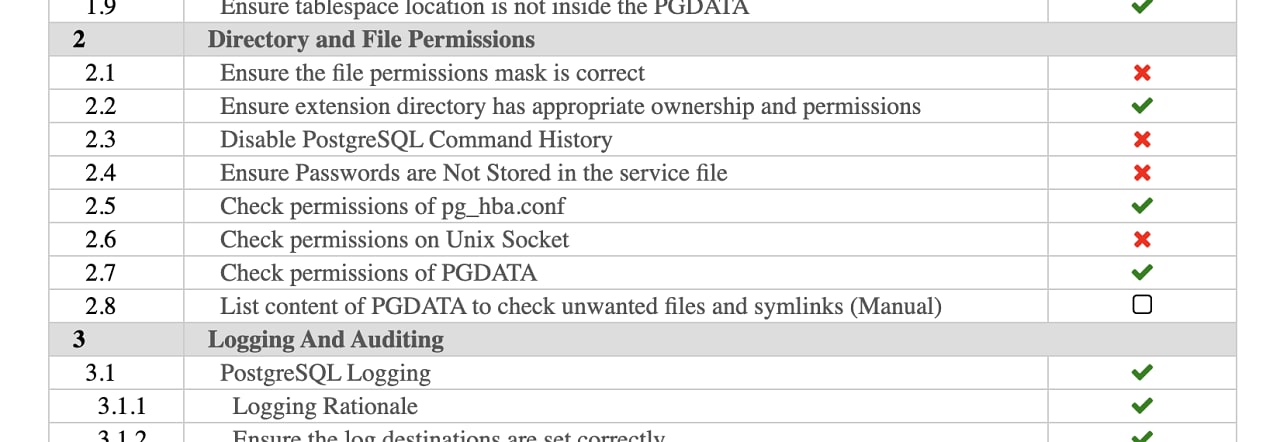 pgdsat 2.0: Database Security Assessment Tool — Checks your Postgres cluster for almost a hundred security related matters (like file permissions, config settings, replication setup, etc.) including all recommendations from the CIS compliance benchmark. The output is a report like this. HexaCluster Corp |